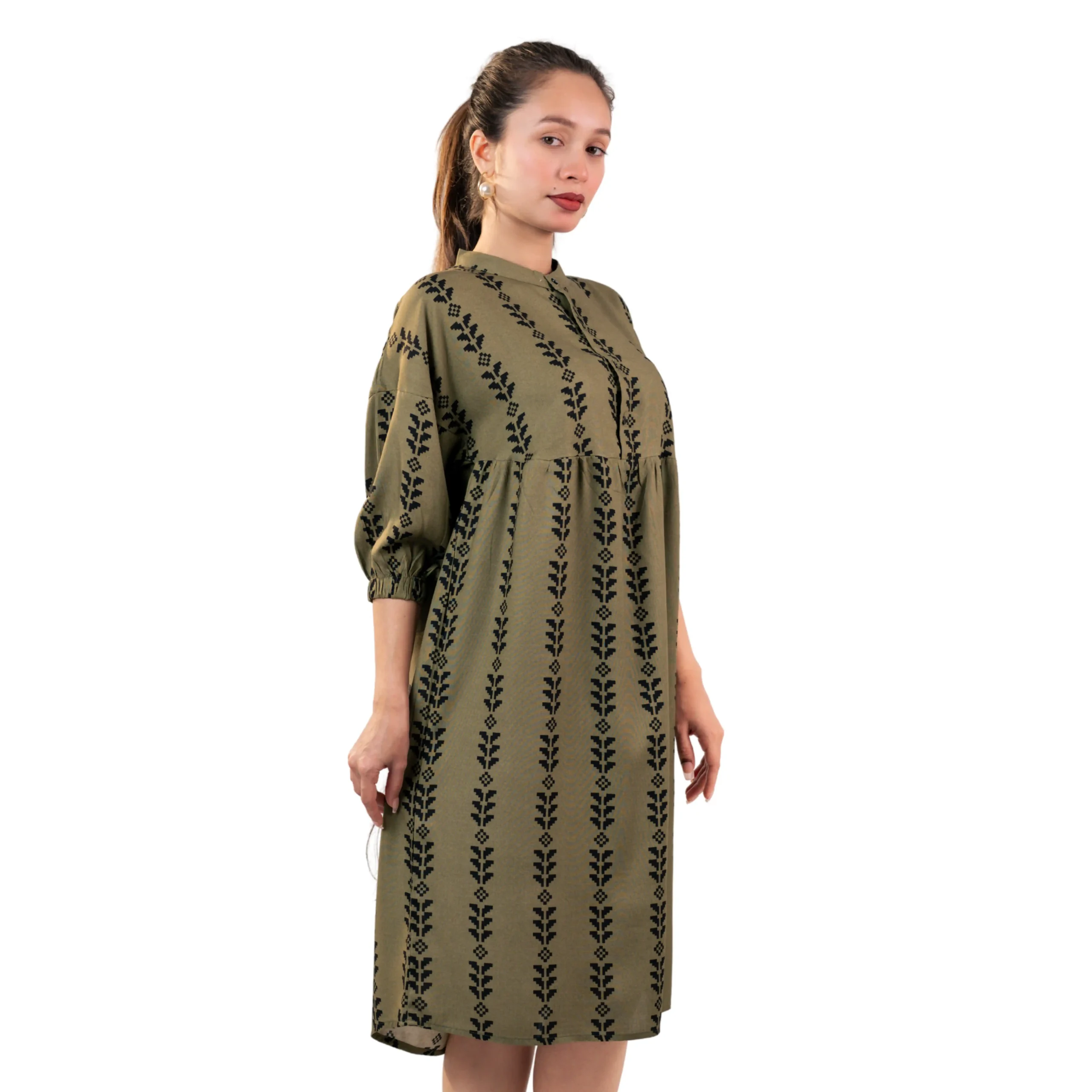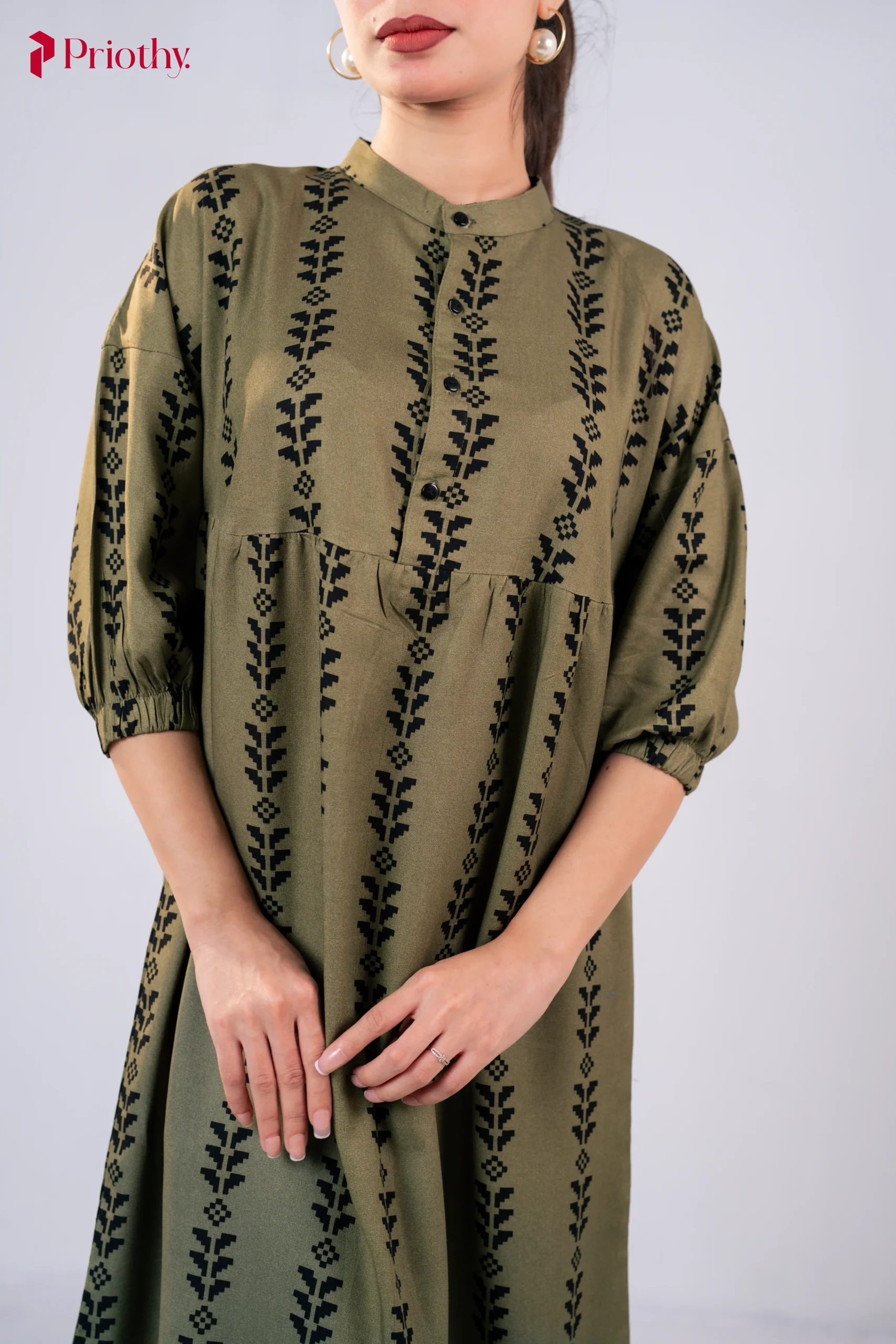 Color: Olive Green with Black Vertical Ethnic Print